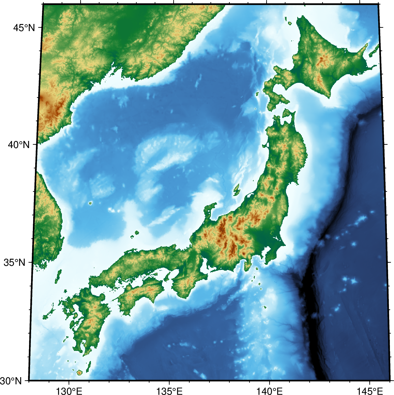 カラーマップの種類はGMTのcookbookに記載されています.とても種類が多いですが,地形の描画に向いているのはearth, geo, etopo1, globe, relief, terra, worldあたりです.ただし,このうちterraとworldはデフォルトのカラーパレットの範囲が日本海溝の最も深い部分をうまく表現できないようで,範囲の調整が必要になりそうです.