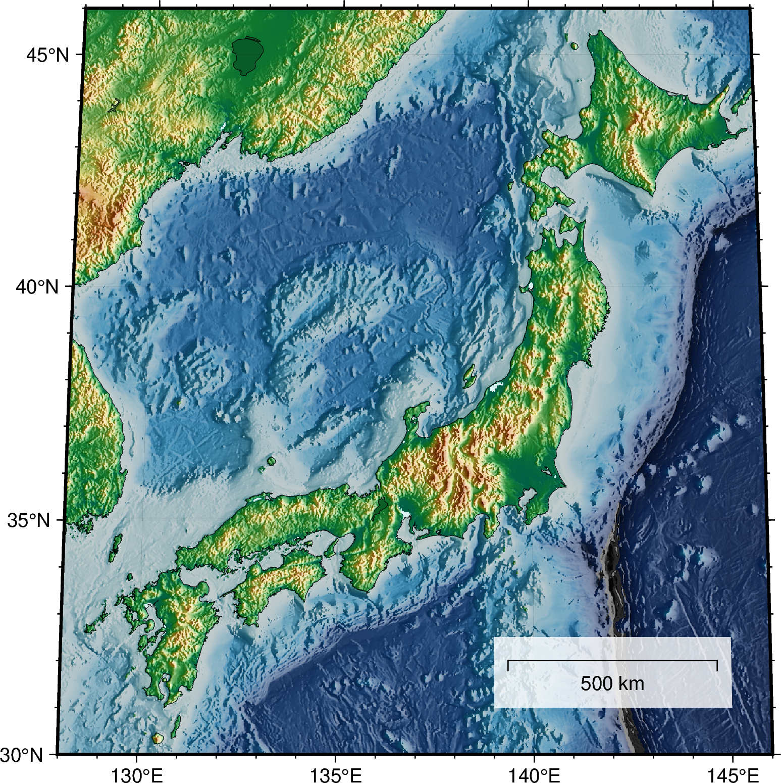 まず,単に fig.grdimage で色を塗るだけでなく,その上に海岸線を描画しています.さらに,この例で用いた earth カラーパレットは陸域と海域の差が目立たなかったため,fig.coast の water で透明度80%の黒色(black@80)で海域を塗りつぶすことで,相対的に陸域が浮かび上がって見えるように工夫しています.色名のあとの@は透明度指定で,100に近いほど透明度が高くなります.water = 'black@80 の行をコメントアウトして実行してみると,その差が実感できるでしょう.ただし,このテクニックを使うともとの色を改変することになりますので,カラースケールを表示してもその色が正確ではなくなりますので,注意が必要です.
