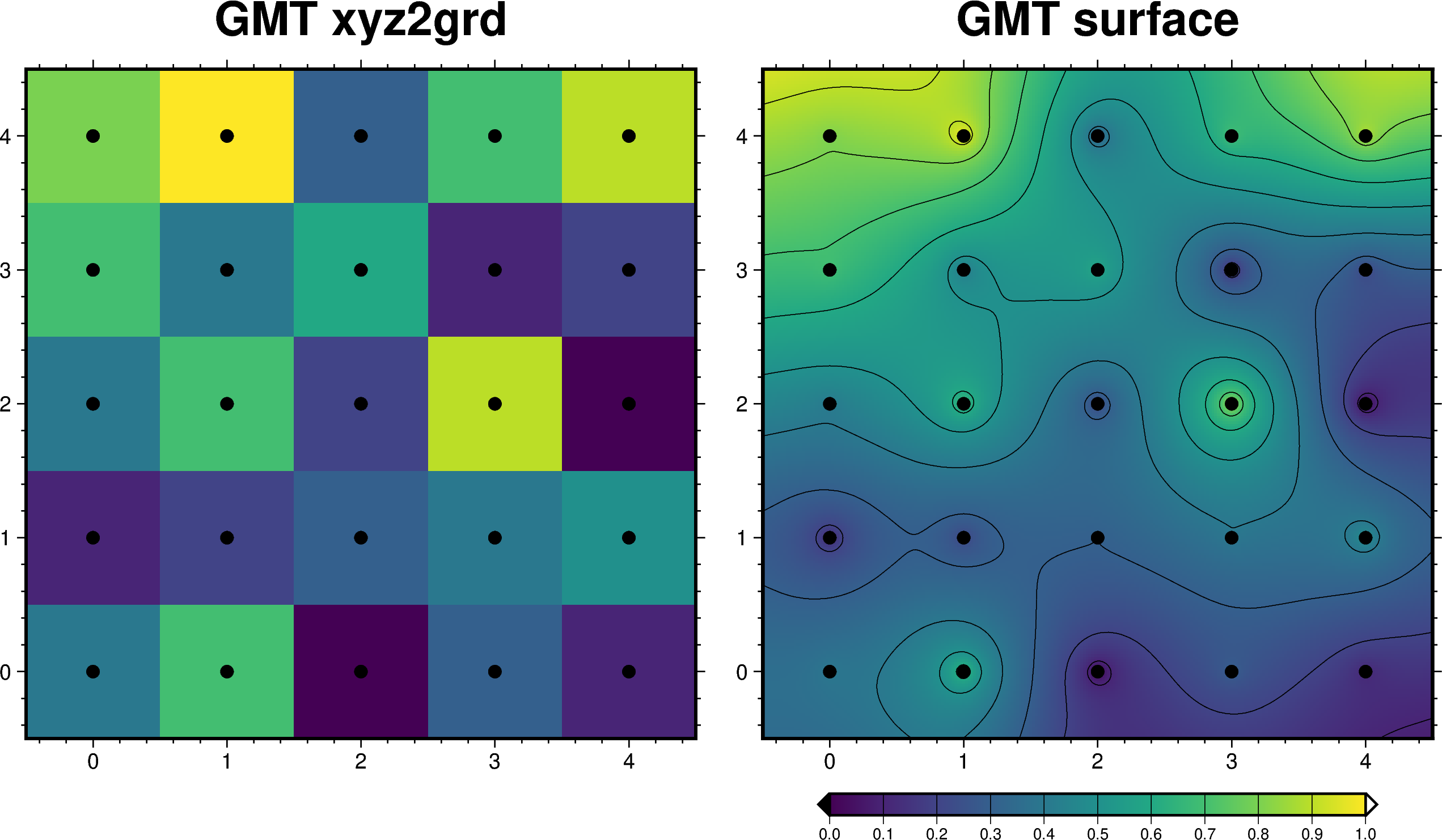ここで作られたデータを ravel()メソッド1次元化し,pygmt.surfaceで補間をしてみます.比較のため pygmt.xyz2grd で粗い間隔のままのプロットも作成します.