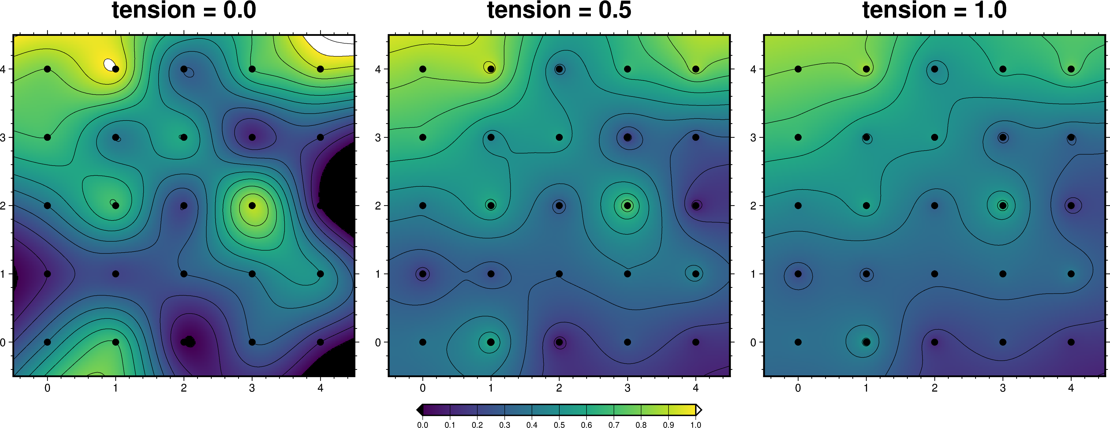 surfaceによる補間の挙動は,tensionパラメタによってだいぶ変わります.tensionを変えてみて,補間の違いを見てみましょう.
