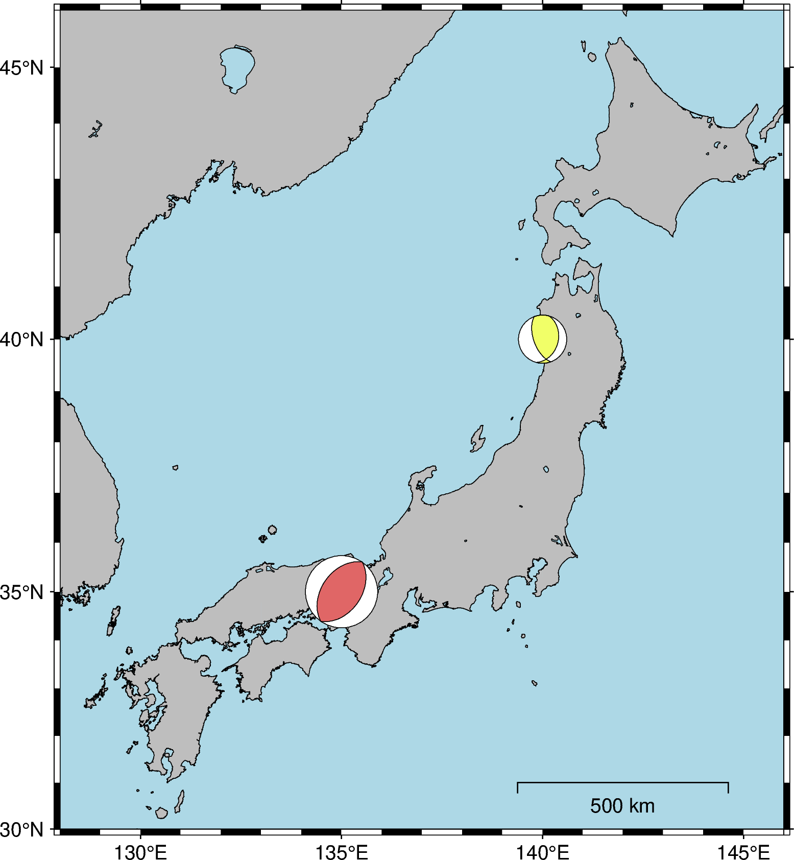 gmt end上記のスクリプトを実行すると,下図のようなメカニズム解とその鉛直断面図が得られます.