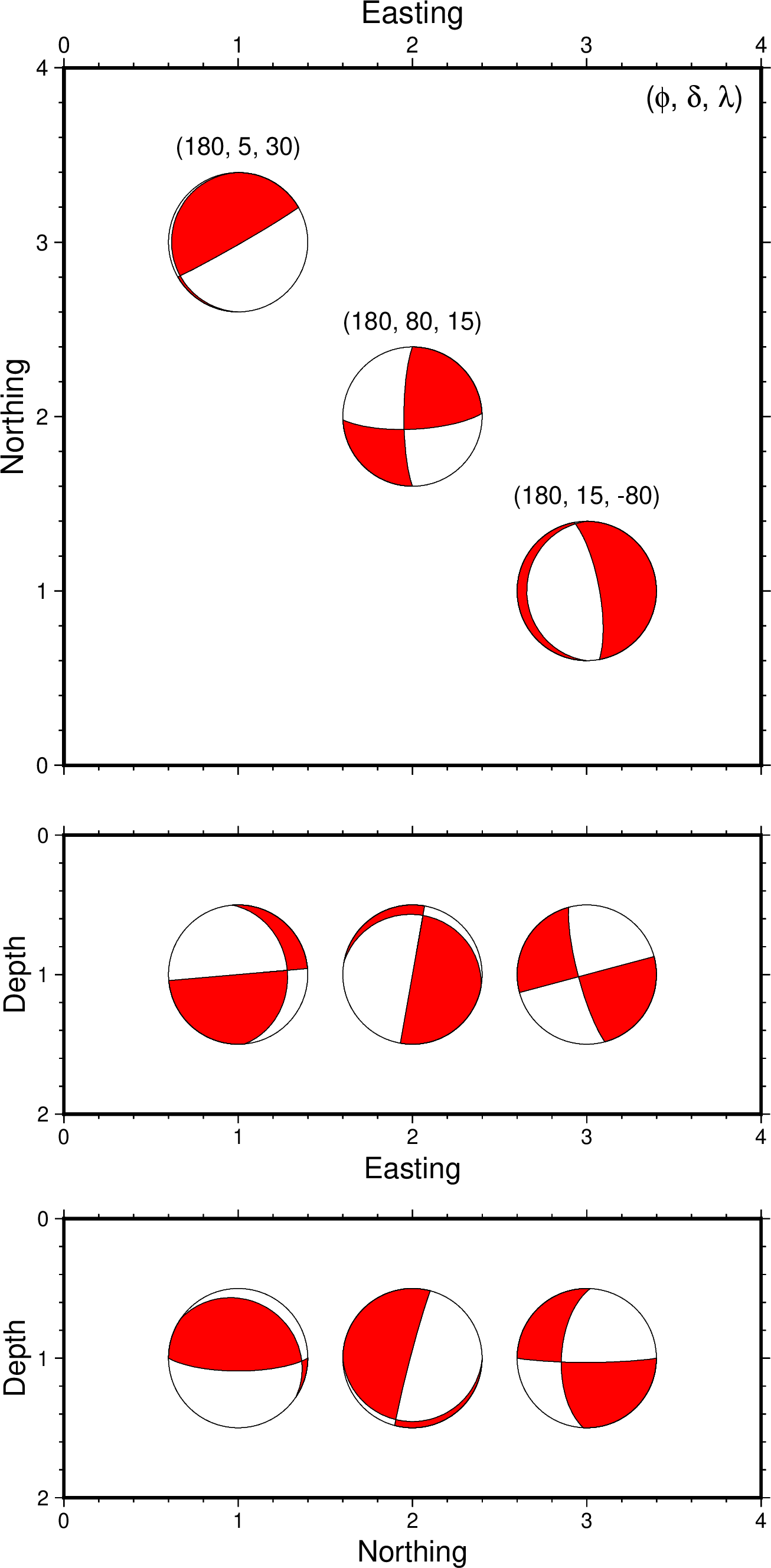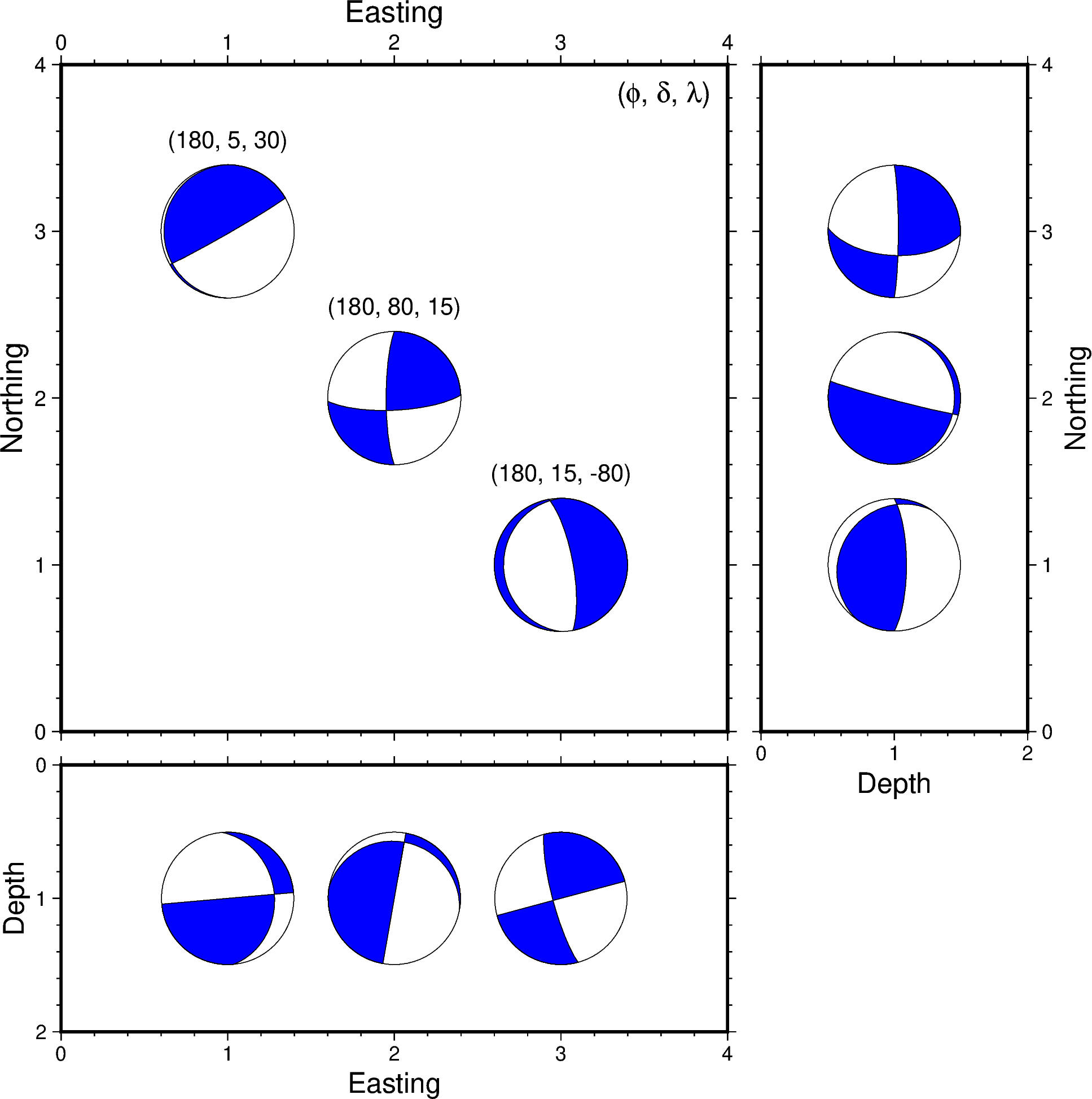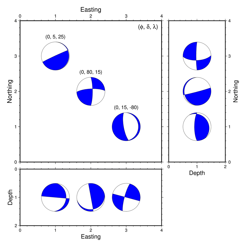 本家GMTにおけるcoupe利用の簡単な例として,3つのメカニズム解の東西鉛直断面と南北鉛直断面を表示するスクリプトの例を以下に示します.