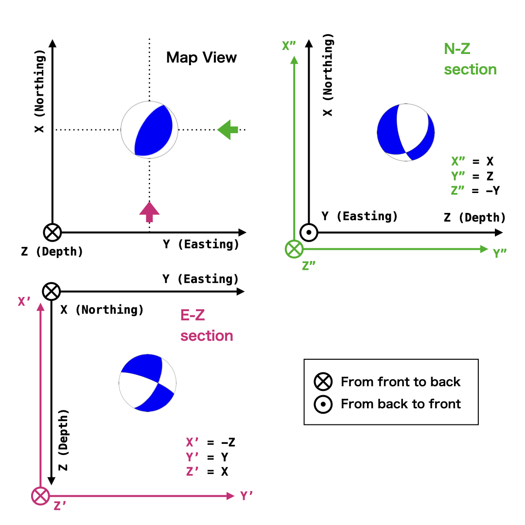 PyGMTの meca モジュールは,(入力フォーマットは様々ですが,本質的には)モーメントテンソルを水平面内(XYもしくはlon-lat座標系)において下半球投影したものを可視化してくれます.ここでは,その meca モジュールはそのままに,モーメントテンソルのほうを座標変換してしまうことで,異なる方向から見たモーメントテンソルがプロットされるようにしてみます.具体的には,以下の図で模式的に示すような \((X,Y,Z)\)から\((X', Y', Z')\)(東西鉛直断面)あるいは\((X",Y",Z")\)(南北鉛直断面)のような変換を考えます.