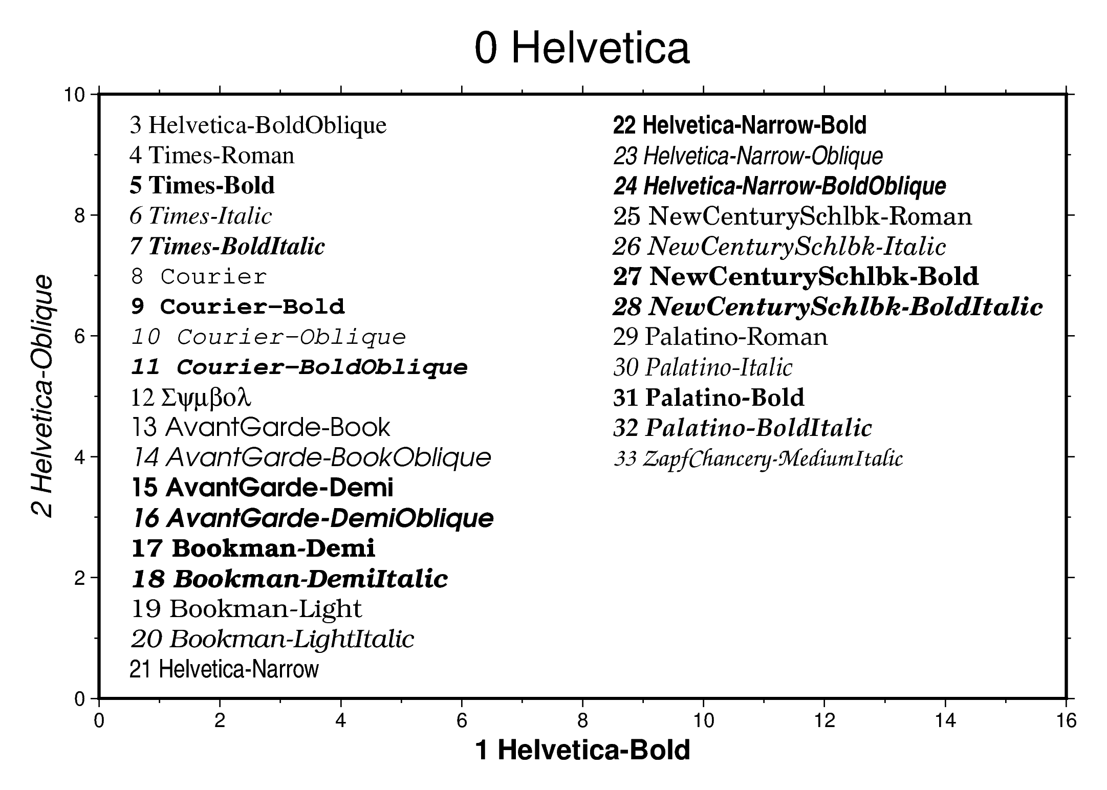 fig.text(x=8.5, y=8.5, justify='LM', font='12p,24,Black', text='24 Helvetica-Narrow-BoldOblique')